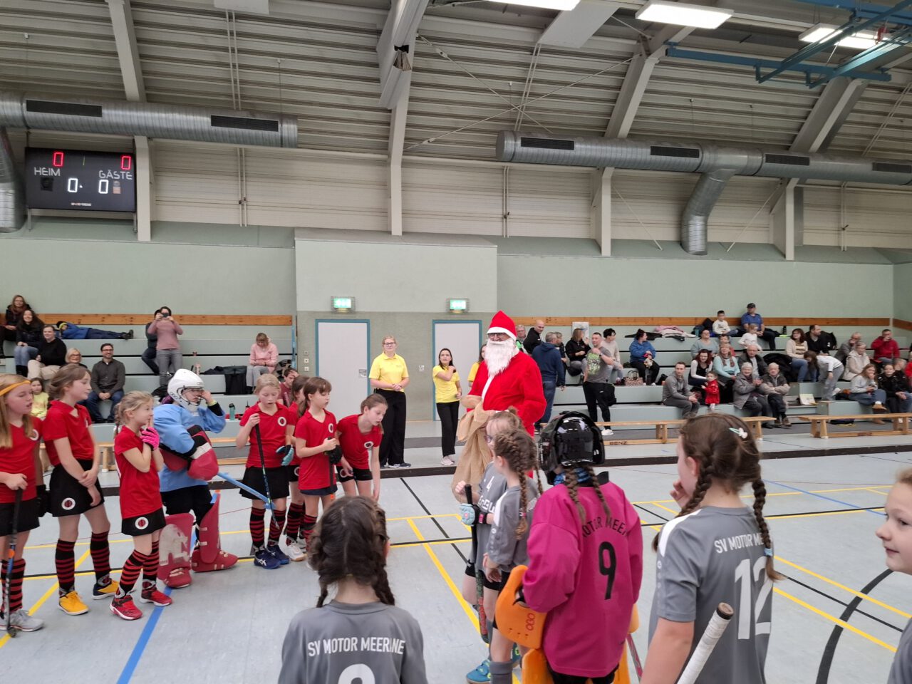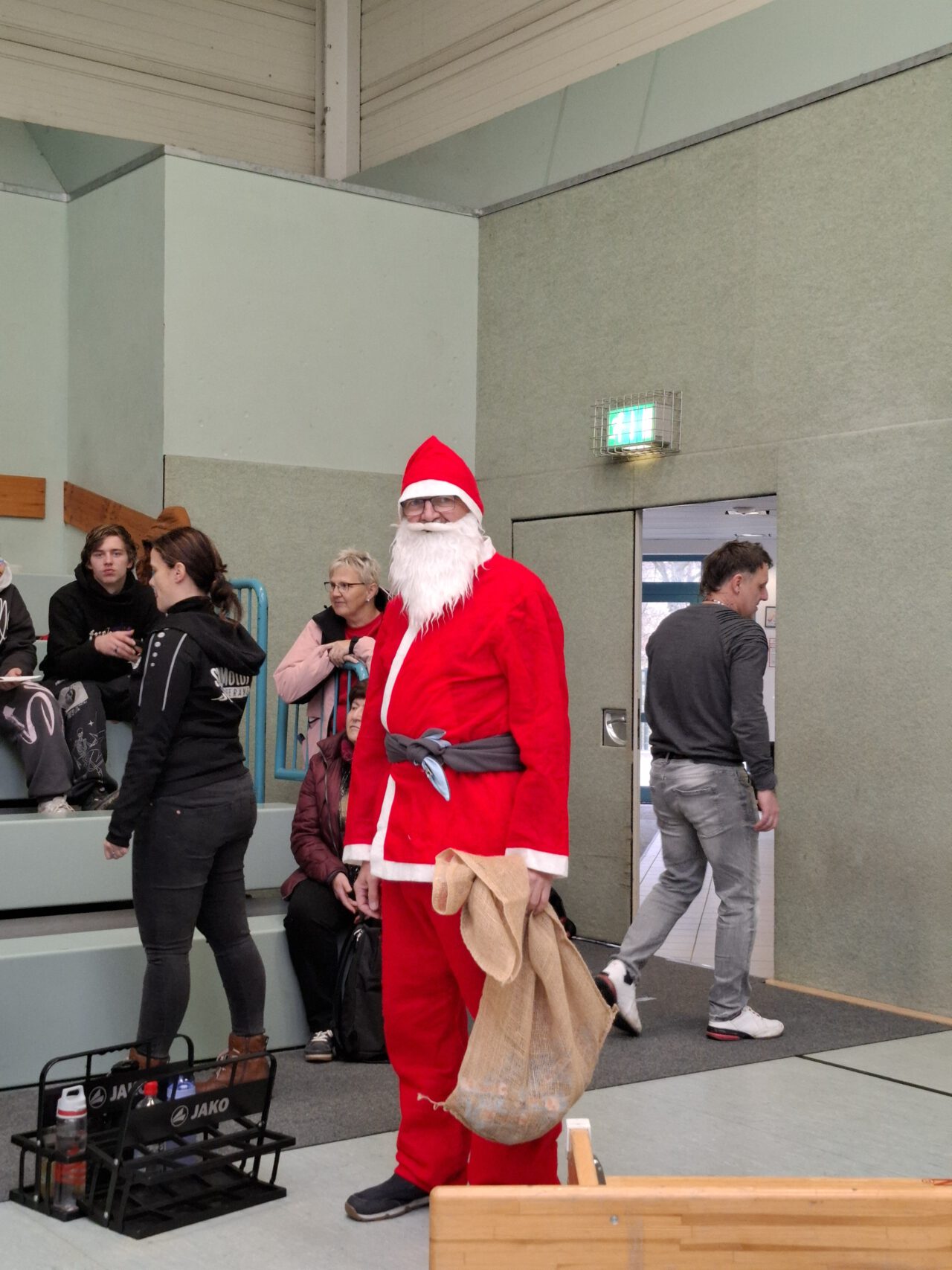 Nach dem ersten Spiel dieses Tages wussten wir auch, wer denn am 6. Dezember unbedingt den ersten Spieltag in Meerane haben wollte 😉 – Plötzlich kam der Nikolaus höchstpersönlich in die Halle und aufs Spielfeld. Er hatte für alle Spielerinnen unserer und der angereisten Mannschaften eine kleine Überraschung, die er aus seinem Jutesack hervorzauberte.