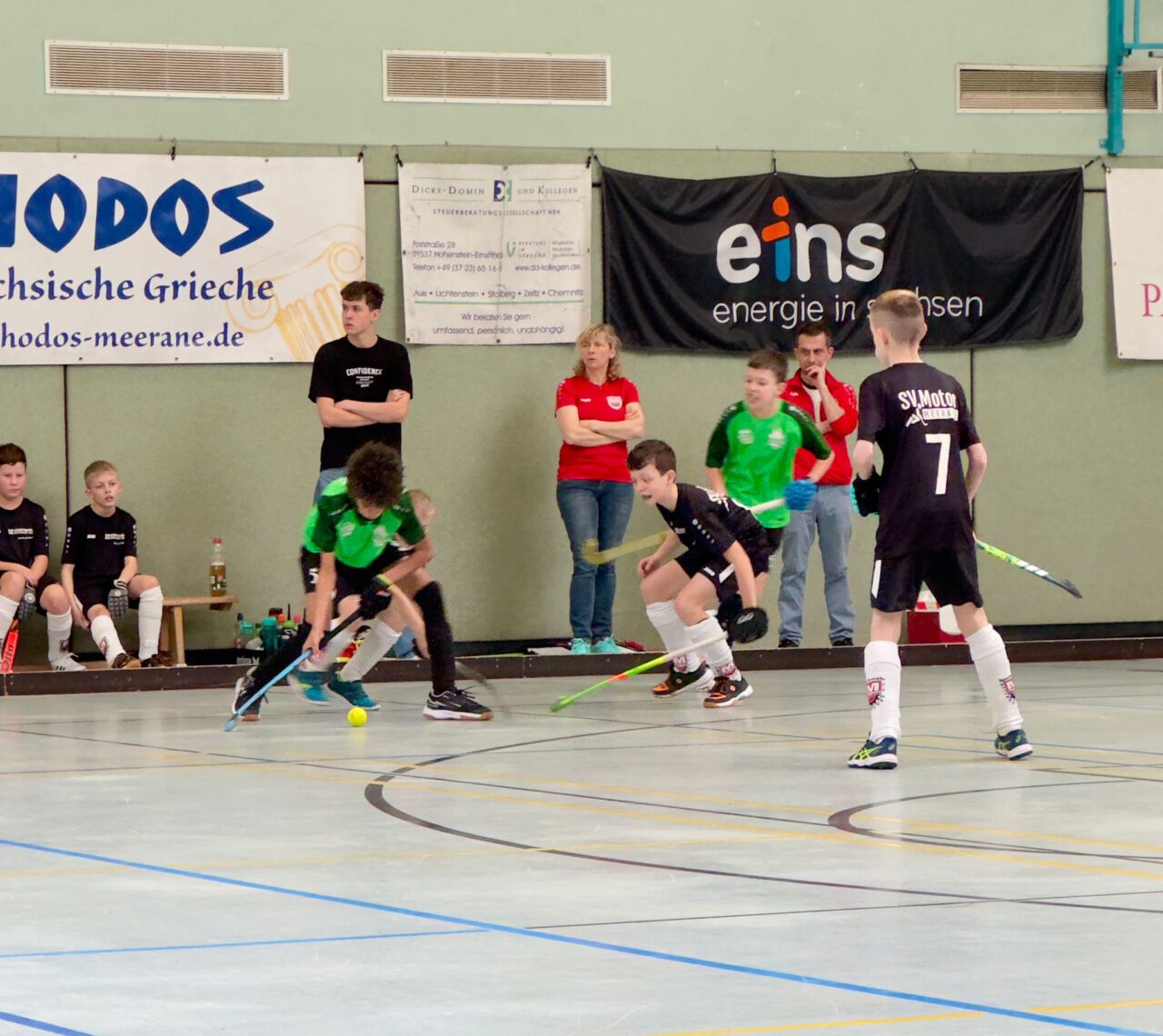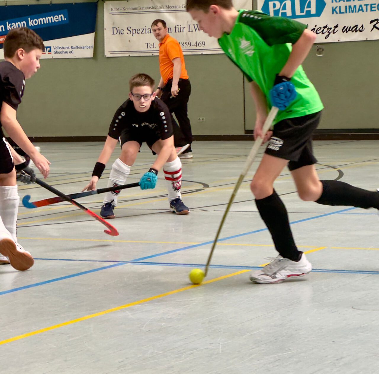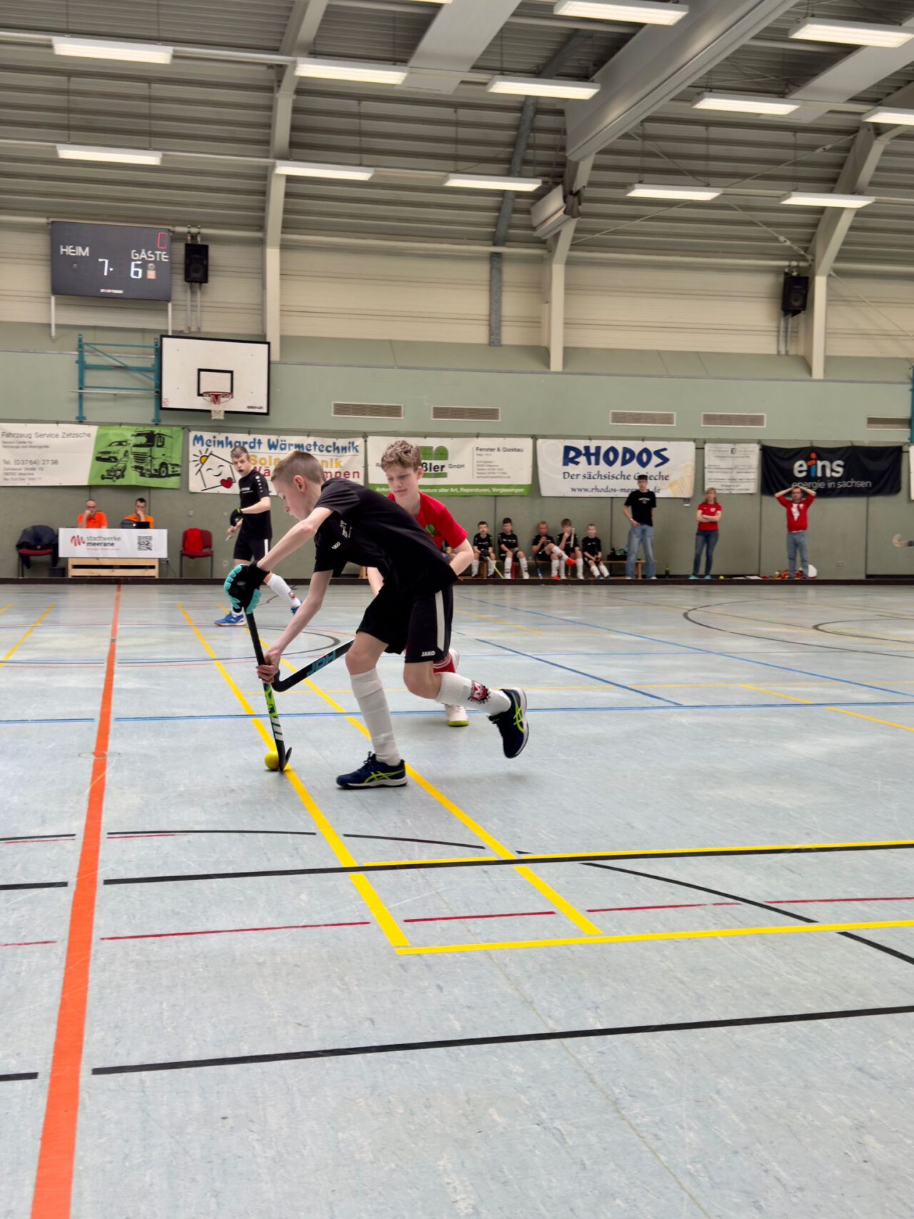 Das Spiel blieb schnell, manchmal etwas unkontrolliert, aber Meerane drängte immer wieder nach vorn. In der 7. Minute lief ein schöner Spielzug über die Bande – eine tolle Idee, doch Tom fehlte am Ende ein kleiner Schritt.