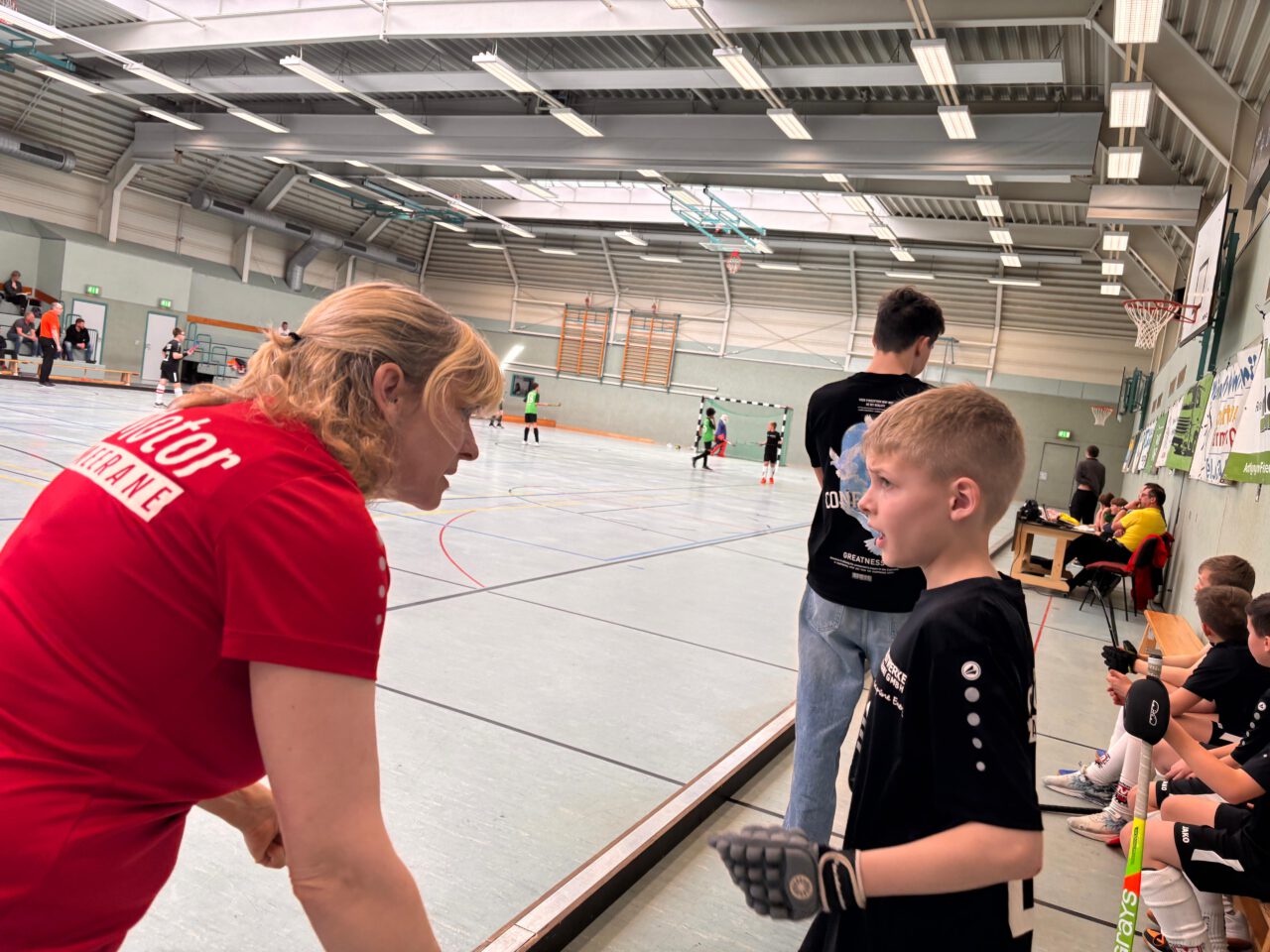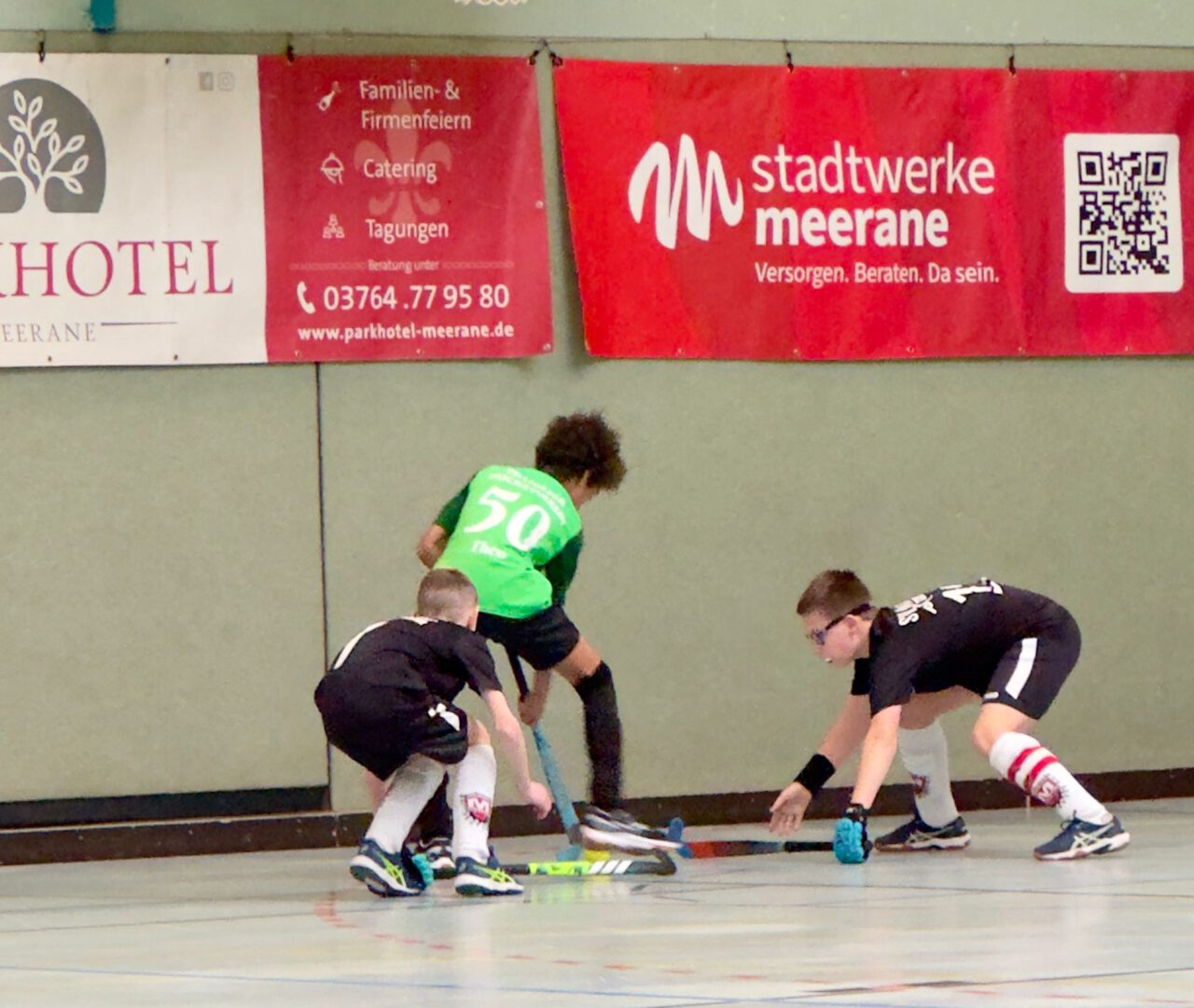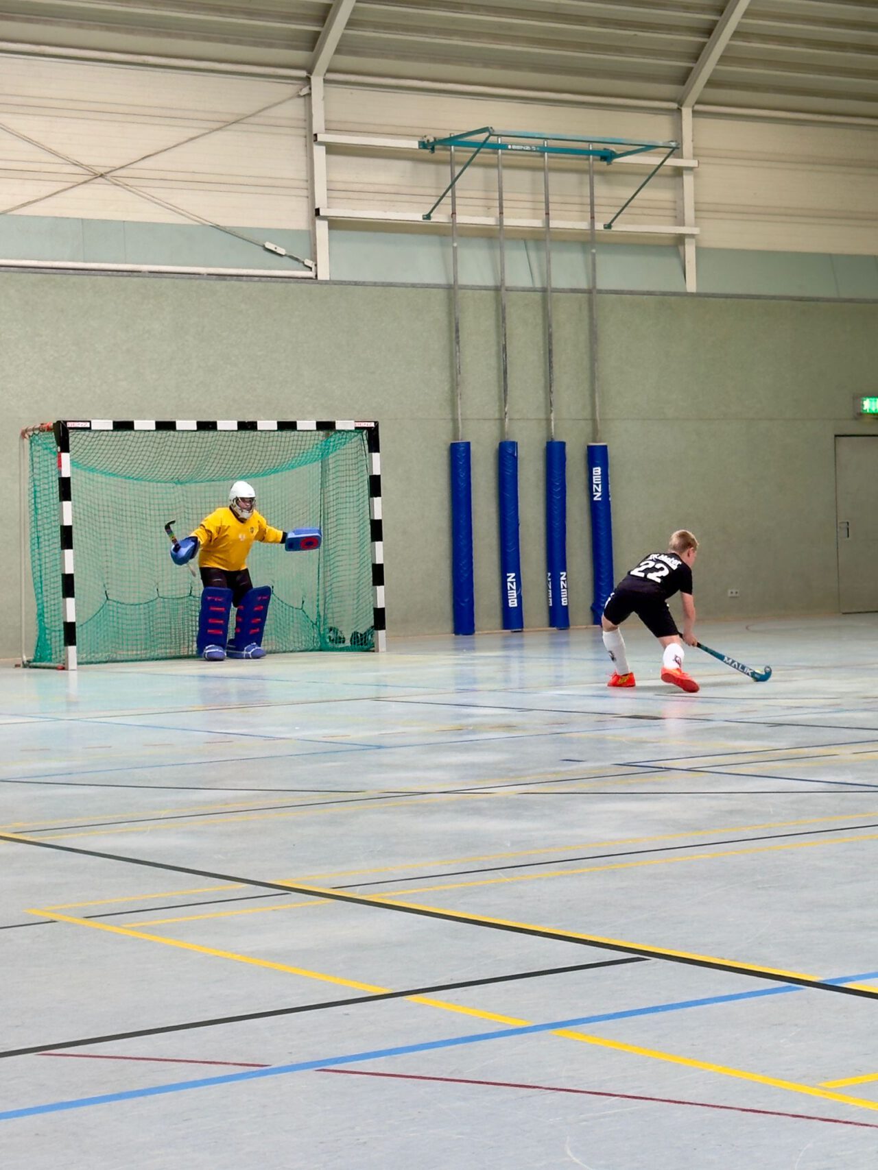 Das Spiel blieb schnell, manchmal etwas unkontrolliert, aber Meerane drängte immer wieder nach vorn. In der 7. Minute lief ein schöner Spielzug über die Bande – eine tolle Idee, doch Tom fehlte am Ende ein kleiner Schritt.